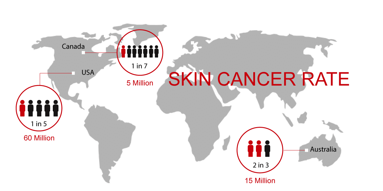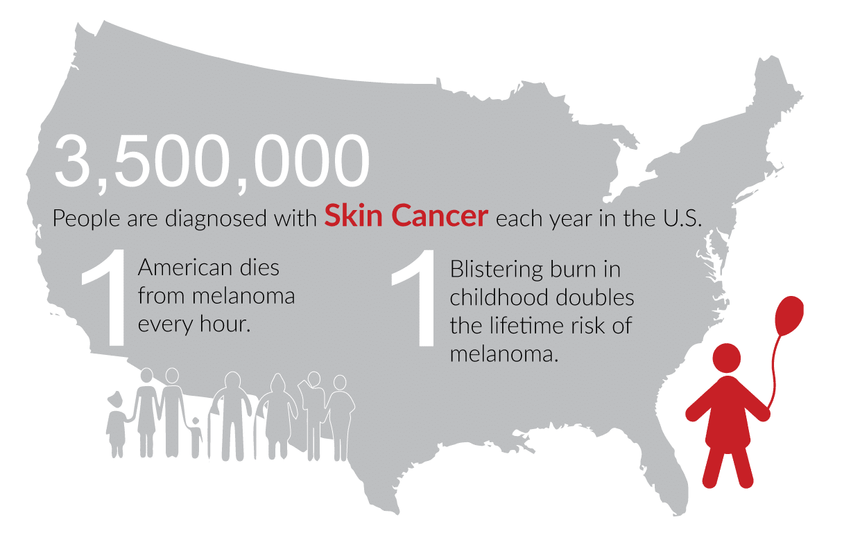 Skin cancer can result from overexposure to UV rays. Melanoma is the most serious type of skin cancer, and it can be lethal. Individuals with skin type 1 (pale skin, light hair and eyes, burn easily in the sun and never tan) are at the highest risk of developing skin cancer. Catching suspicious spots early can mean the difference between life and death. Melanoma spots are usually asymmetrical with an irregular border, and take on a colour unlike other moles on your body. Monitor your moles for these signs, especially any new moles that develop after you turn 30.